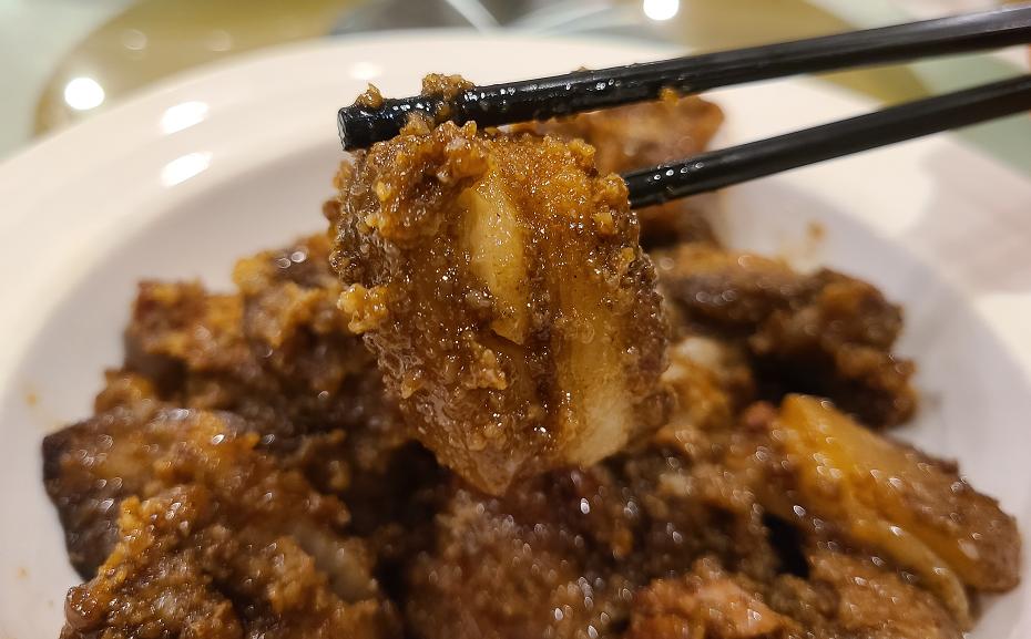 粉蒸肉丨拍摄 呲呲这道粉蒸肉,一上来就是酱色浓郁的一大盘,大量的粉糊糊包裹着肉块,一筷子夹上去,能感受到肥肉和肉皮的弹性。肥肉已经蒸透,呈现出透明的质感。