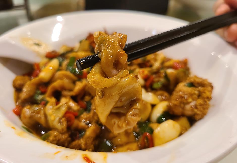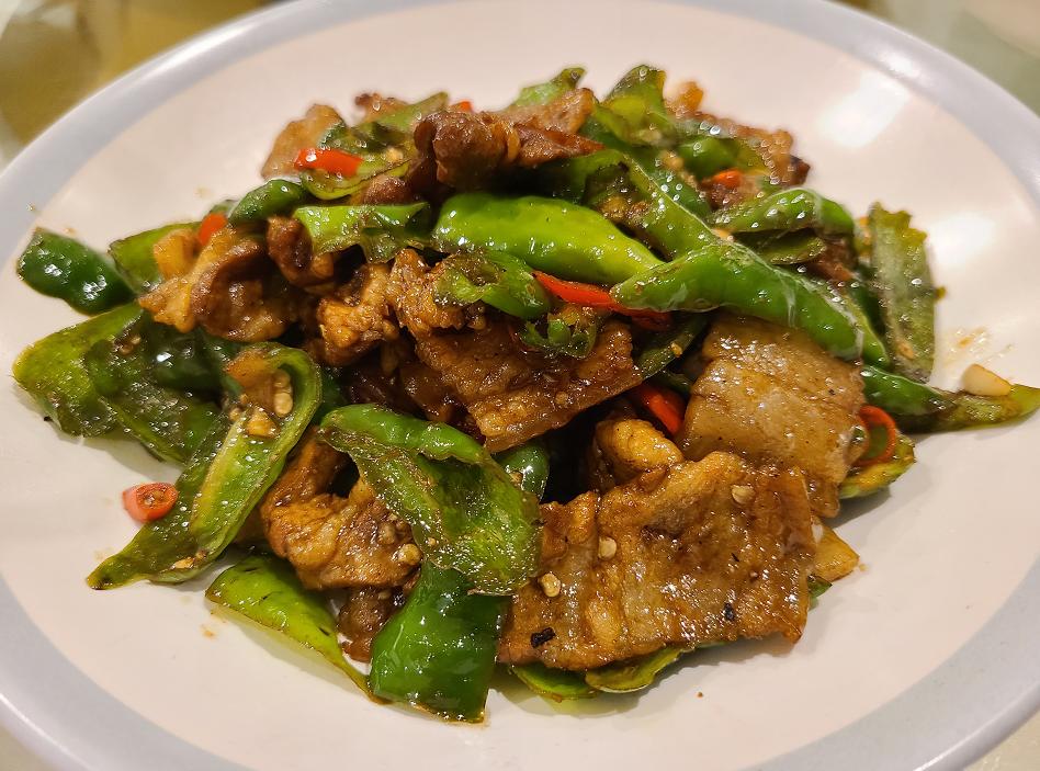 余干椒是江西省的特产辣椒,这道菜就是用它来炒五花肉,整体口味非常辣和咸。青椒不仅仅是被切成了块,还被擂过,因此辣度翻倍。五花肉不油腻但却很咸,如果主食不配米饭,不要轻易尝试它。