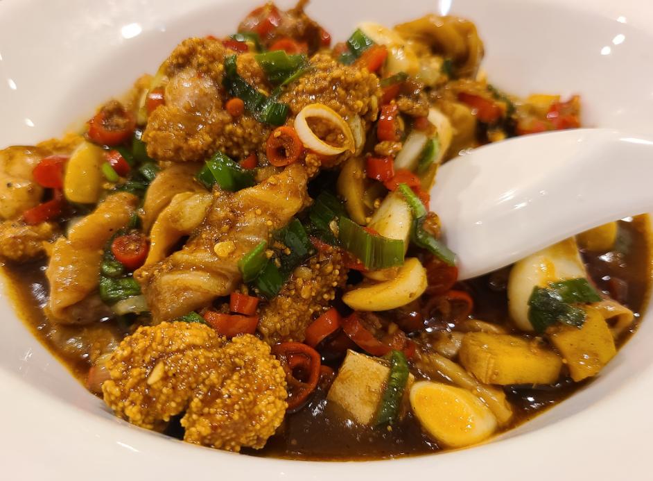 ▼ 朋友阿肚的点评:点了几个网友们推荐的菜,拆骨凤爪几乎桌桌必点,红艳艳的辣椒堆下是已经被剔掉骨头糯叽叽的凤爪,软糯粘嘴、香辣入味,确实不错。藜蒿鲜嫩多汁,安徽小伙伴说和他们老家的味道差不多。鱼杂腥味有点重了,这道菜是被剩下最多的。最惊艳的居然是红烧肉,炖到是真·入口即化,戳一戳就化为肉汁,拌饭一绝。