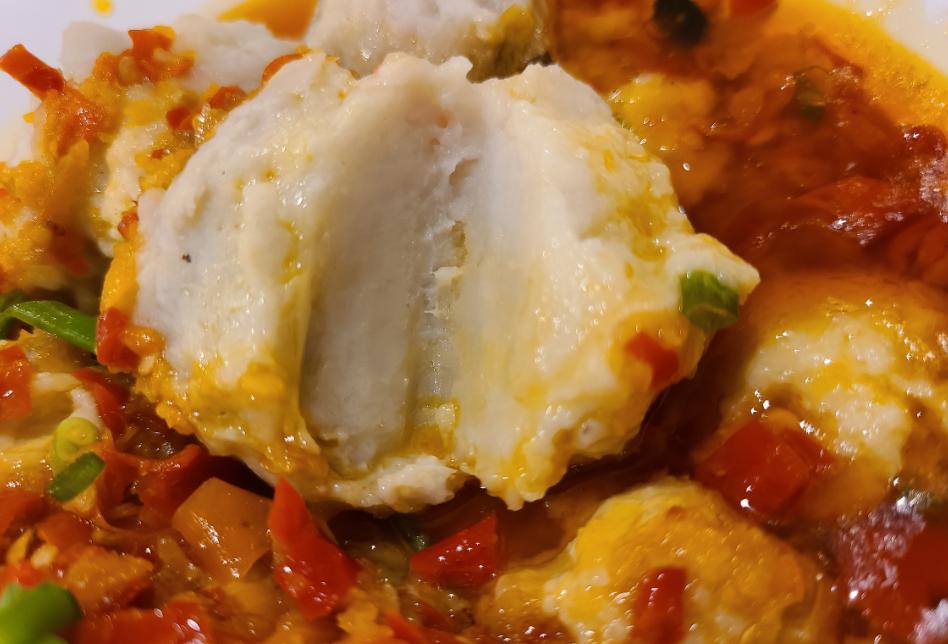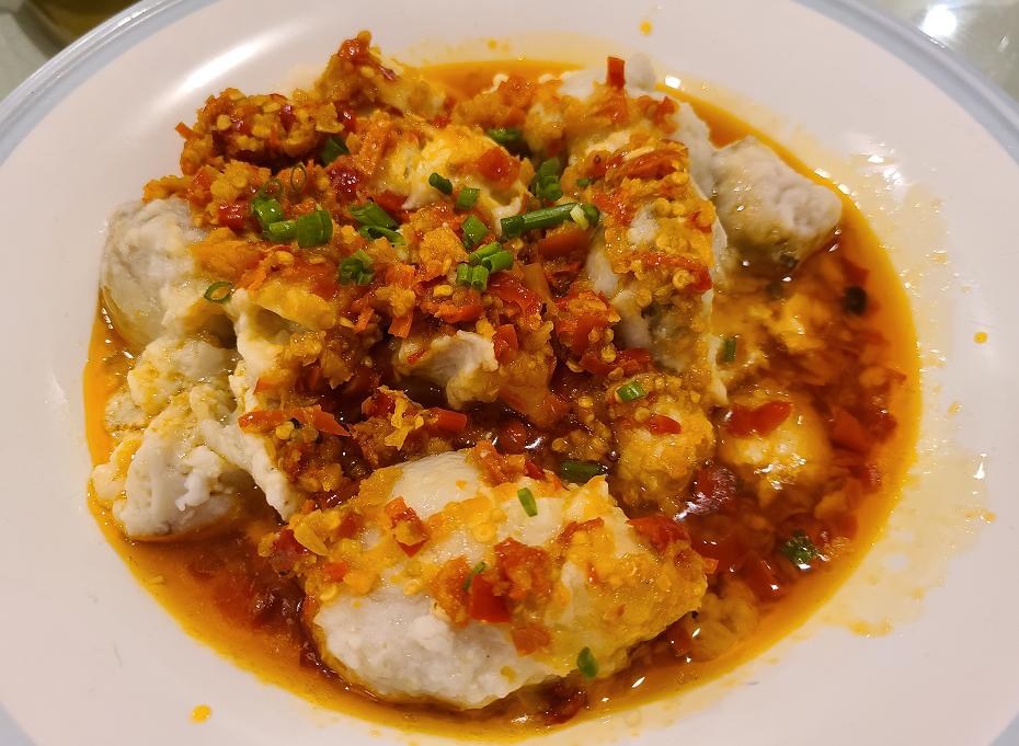 这道后补的菜,酸辣非常到位。大块的芋头被酸辣的剁椒和红油包裹住,顶上再点缀些葱花。
