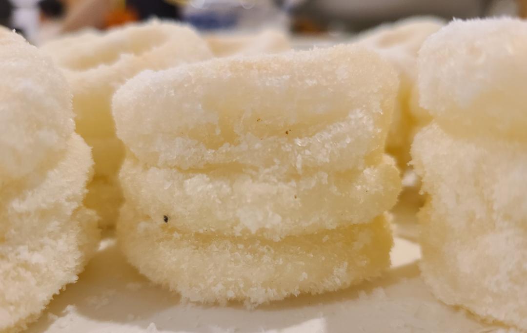 它们长得像巨型的圆形戒指,看起来酥脆的外皮上裹着白色的颗粒。糯米为原料做成的白糖糕,软糯中带有一种空气感,入口有一股椰子的清香,甜味适中,对于不爱吃甜食的人来说都觉得甜得恰恰好。