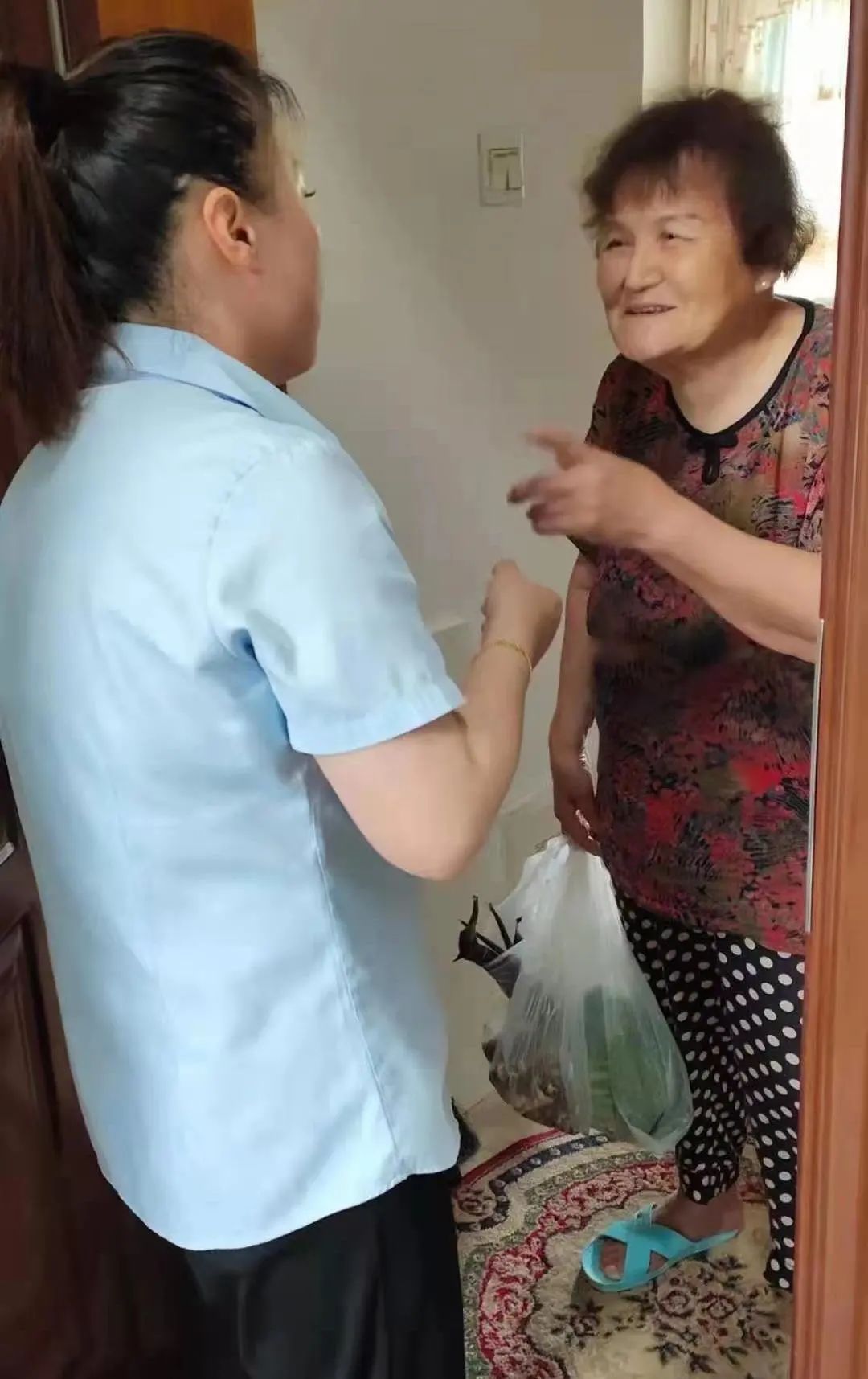 “鲁阿姨,在家吗?台风要来了,我们来给您送点东西。”今天一早,家住鄞州区东柳街道太古城社区的独居老人鲁秋花接到了一通暖心电话。放下电话后不到10分钟,东柳街道太古城社区“柳之和”巾帼志愿团队红蚂蚁助老志愿队的两名志愿者就送来了新鲜的蔬菜、水果和牛奶。接过这份带有温度的“台风礼物”后,鲁秋花很感激地说:“谢谢你们考虑得那么周全!”