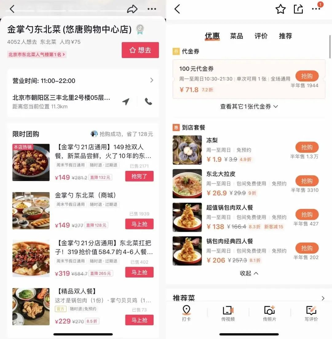 这些商家在抖音上架的套餐种类更丰富,给消费者的选择余地更大。以一家金掌勺东北菜为例,在上架套餐方面,商家在大众点评上架的商品共4个,其中2个属于单品优惠,另外1个双人餐和1个四人餐才是套餐;而商家在抖音平台提供的可选套餐有4种,其中有3个不同种类的双人套餐、1个4-6人套餐可选。