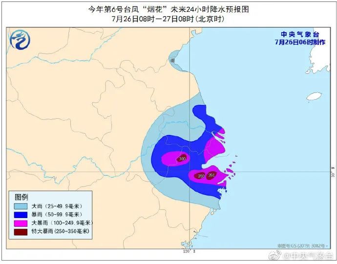 来源:中央气象台降水预报:26日08时至27日08时,浙江中北部、上海、江苏中南部和东部、安徽东南部等地有大雨或暴雨,其中,浙江北部、上海、江苏东南部、安徽东南部等地的部分地区有大暴雨,浙江北部等地的局地有特大暴雨(250-350毫米)。