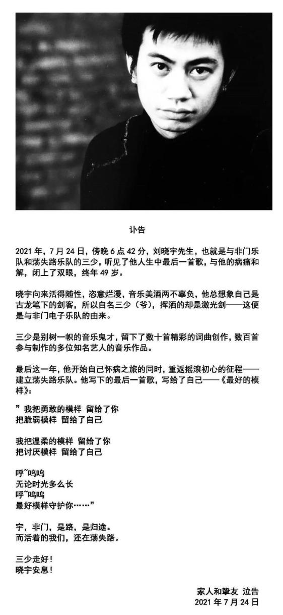 7月24日晚,与非门乐队成员发布讣告,宣告与非门乐队创始人、词曲创作兼音乐制作人刘晓宇,即音乐人三少,因患癌医治无效于北京时间2021年7月24日18时42分辞世,享年49岁。