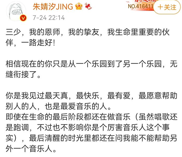 参加过《乘风破浪的姐姐第一季》的歌手朱婧汐,发长文回忆与三少的过往,她感叹“我的恩师,我的挚友,我生命中最重要的伙伴,一路走好!”