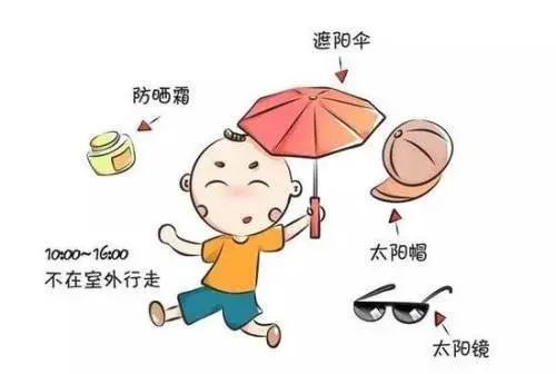 5、躲避烈日夏日出门记得要备好防晒用具,最好不要在10点至16点时在烈日下行走,因为这个时间段的阳光最强烈,发生中暑的可能性是平时的10倍!如果此时必须外出,一定要做好防护工作,如打遮阳伞、戴遮阳帽、戴太阳镜,最好涂抹防晒霜;准备充足的水、菊花茶、绿豆汤等。此外,在炎热的夏季,防暑降温药品,如十滴水、龙虎人丹、风油精、藿香正气水等一定要备在身边,以防应急之用。外出时的衣服尽量选用棉、麻、丝类的织物,应少穿化纤品类服装,以免大量出汗时不能及时散热,引起中暑。