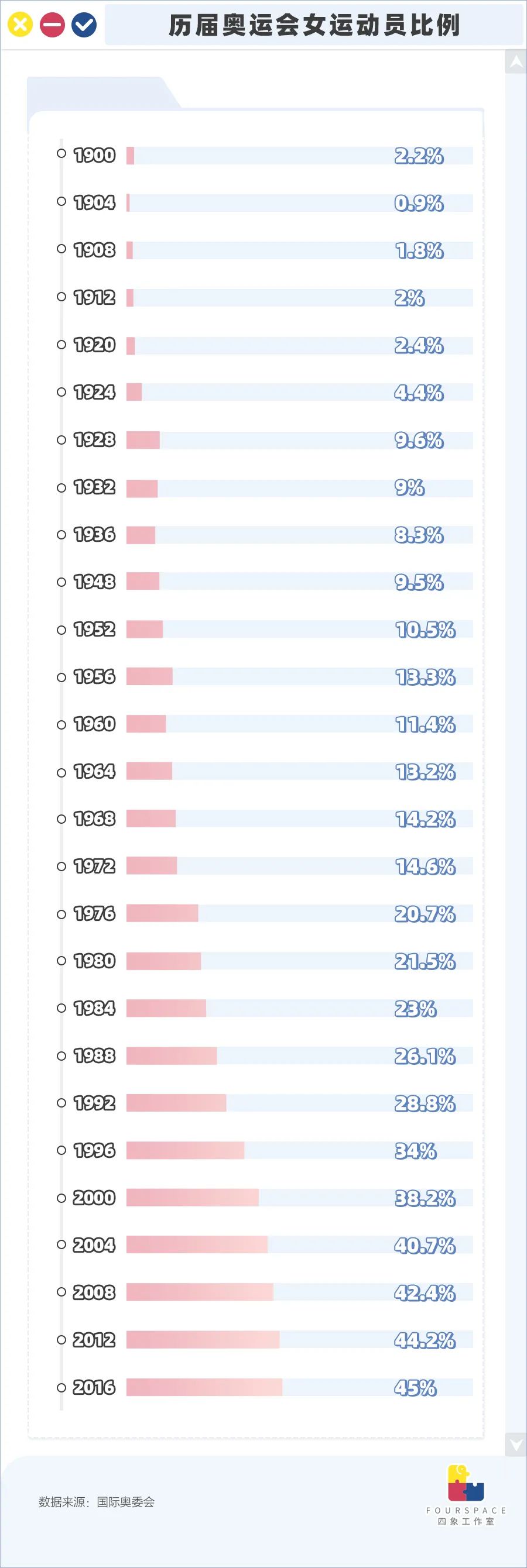这之后单项联合会、社会舆论与保守的奥组委之间经历了多年的拉锯,奥组委迫于压力慢慢增加了女子项目。随着赛场大门敞开,女运动员比例也在缓慢提升,直到2004年奥运会度过百年生日时,女选手人数达到4329人,占比终于突破40%。