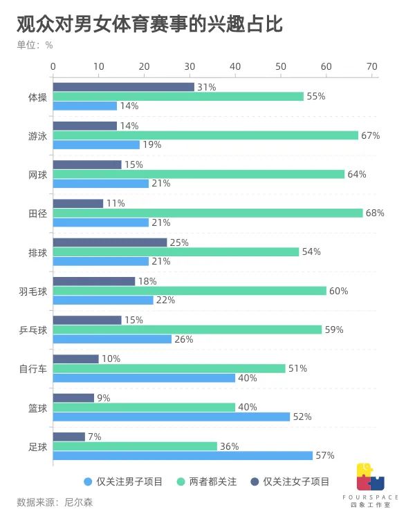 此外作者提醒2019年的比例看似有所提升,但这里不可忽略的一个因素就是这一年举办了女足世界杯,如果剔除世界杯的影响,占比将会从5.1%降至3.5%。另外根据联合国教科文组织的数据,女子体育在全球所有体育媒体中出现比例仅为4%。奥运会、世界杯一类的大赛可能是她们为数不多能收获关注的机会。然而不报道真的是因为没人看女子赛事吗?尼尔森在调查了包括中国在内13个国家的奥运会观众后发现,除篮球和足球外,大多数观众对奥运赛场男女赛事都很关注。