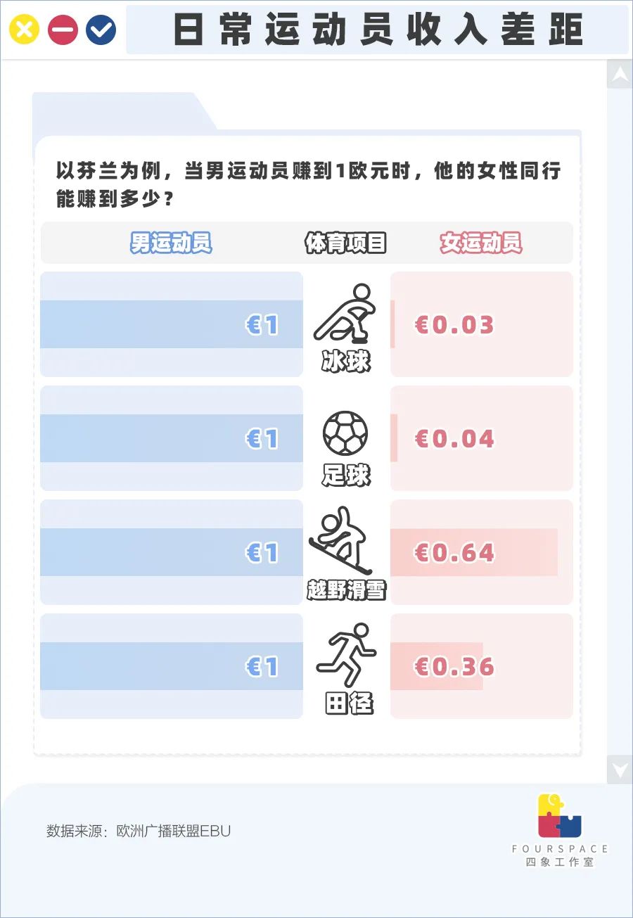 在一项关于北欧运动员薪水的调查中,研究者们发现即使在这些对女性权益关注度比较高的北欧国家,体育界的薪资差异依然十分巨大,例如冰球项目的男女运动员收入相差超过30倍,即便是名将也难以幸免,过于微薄的收入甚至影响到了她们的生活。