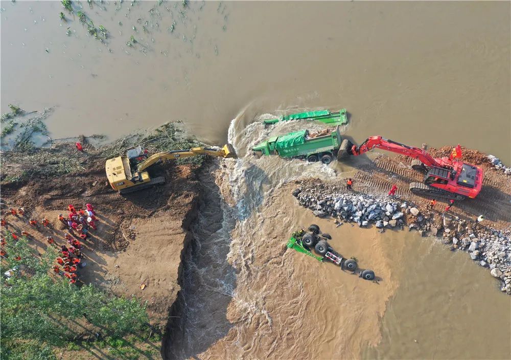 7月25日,满载石料的重型卡车被推入卫河鹤壁市浚县新镇镇彭村段的决口处(无人机照片)。新华社记者 张浩然 摄看着从各地赶来的消防官兵,开着冲锋舟、皮划艇一刻不停地救人。李朝娟抹了抹眼泪,“我弟弟也是当兵的,真看不得这个。”