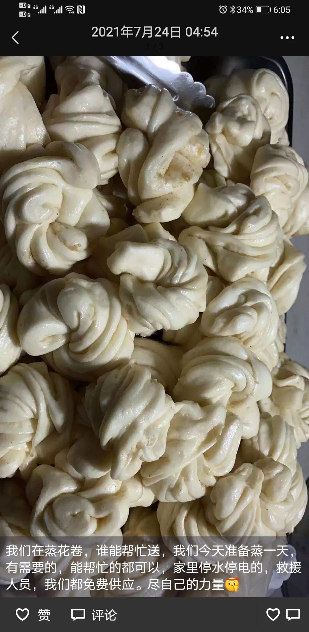 和面、制油酥、做生坯、进蒸屉,凌晨4点54分,第一锅花卷已经出锅。这时,李朝娟继续在手机上发布“谁有时间来送花卷,家里停水停电的、救援人员我们都免费供应”。