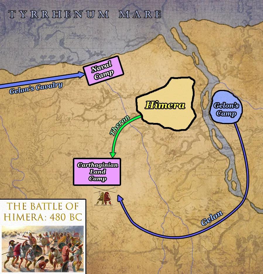 此时,岛屿北部的爱奥尼亚希腊人还企图保持中立。然而,盖隆与塞隆的联盟却不愿意放过他们。为了多利亚群体的利益,也是出于称霸西西里岛的战略必然,他们终于将魔爪伸向北部的海滨城市希梅拉。利用大笔资金支持民主派得势,驱逐了同自己不对付的僭主,并准备将之纳入自身麾下。然而,伊奥尼亚移民很快就倒向迦太基一边,怂恿对方击溃两位多利亚僭主的军政同盟。后者尽管反应较慢,却还是在另一股势力的劝说下动手。