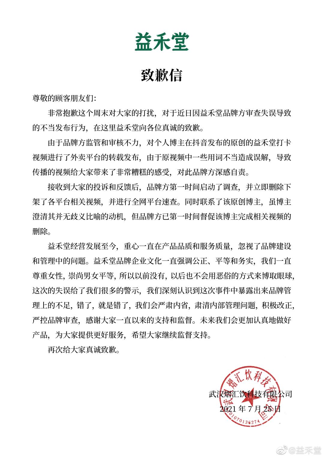7月25日,益禾堂在其官方账号发布致歉信称,此次事件系品牌方审查失误导致的不当发布行为,已删除了各平台相关视频。