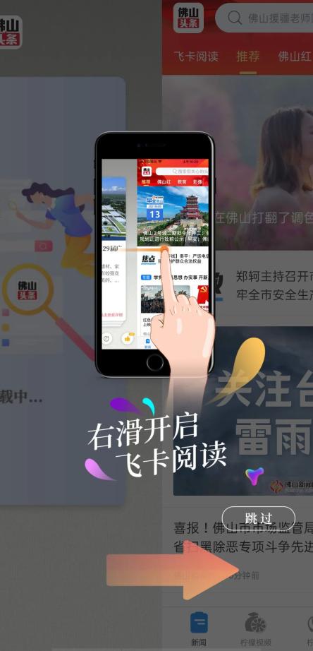 02 打开“佛山头条”客户端,右滑开启飞卡阅读。