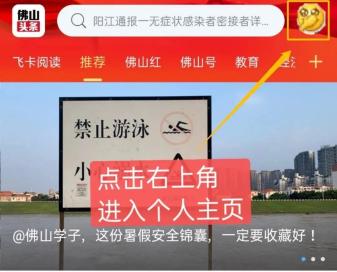 1.新用户下载“佛山头条”APP并注册登录,点击右上角进入个人主页。