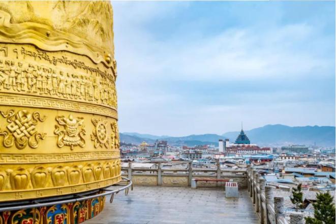 这般坚韧可能来自它的庄洁。庄洁的是寺庙里传来的钟声,以及随处飘摇的经幡。钟声来自大龟山的佛寺,佛寺旁矗立着世界上最大的转经筒。筒壁上雕有四大菩萨,下雕佛家八宝。筒内藏有各种经咒,无字真言124万条,各色佛宝16吨。