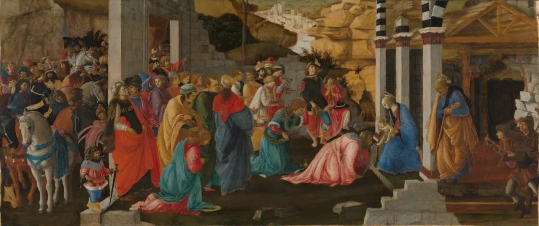 《三王来朝》局部(1470年),现藏59号厅,波提切利、菲利皮诺·利皮(FraFilippo Lippi)绘。佛罗伦萨人庆祝显现节,他们装扮成三王来朝情节里的人物上街游行。看这幅画时可以猜猜哪些人物出自波提切利,哪些出自他13岁的学徒兼师弟菲利皮诺·利皮——波提切利的老师利皮神父的私生子。这幅饱满柔媚的杰作出于两个年龄加起来不到四十的年轻人之手,使人感叹佛罗伦萨画家们天分的早熟。另一位为画廊带来多幅镇馆之宝的是伯顿爵士(Frederic William Burton)。他任职期间(1874年–1894年)英国财富开始洗牌,他在一连串乡村大宅拍卖中捡漏不少,比如拉斐尔为安西帝家族所作的《安西帝圣母》,范戴克的《查尔斯一世骑马图》。但是这样来了几次后,政府就收紧钱袋,伯顿买画需要预先申请报批。