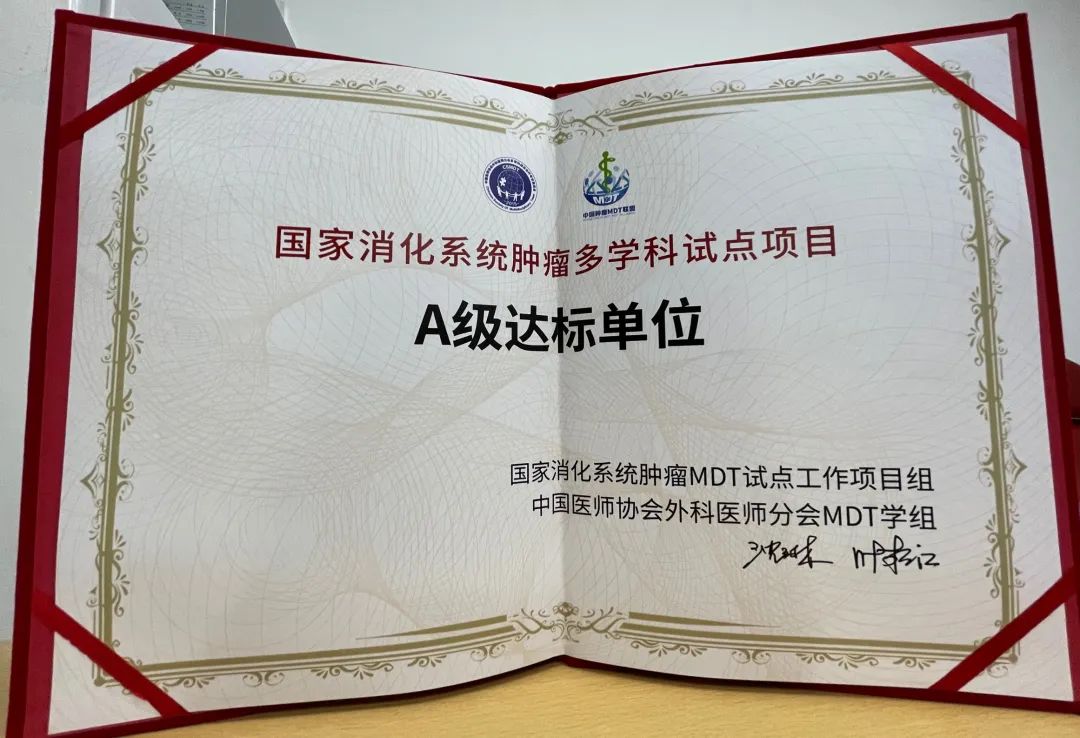 为了进一步推广多学科诊疗模式(MDT),近日,在国家卫生健康委员会医政医管局的指导下,“健康中国2030行动计划-消化系统肿瘤多学科诊疗(MDT)中心”授牌仪式在上海圆满落幕。中国医师协会、中国肿瘤MDT联盟、中国医师协会外科医师分会MDT学组授予我院为“健康中国2030行动计划-消化系统肿瘤多学科诊疗(MDT)中心”,我院同时荣获“国家消化系统肿瘤多学科试点项目-A级达标单位”。这标志着仁济医院在MDT规范化建设过程中走在上海市级医院前列。