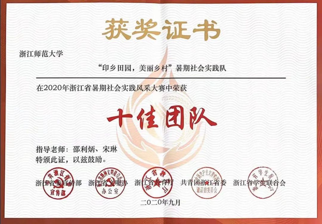 在2020年浙江省暑期社会实践风采大赛中,黄哲浩与他的团队获得了十佳团队并公开展示。而在刚刚落下帷幕的浙江省第十七届“挑战杯”交通银行大学生课外学术科技作品竞赛中,“印乡”团队荣获特等奖。