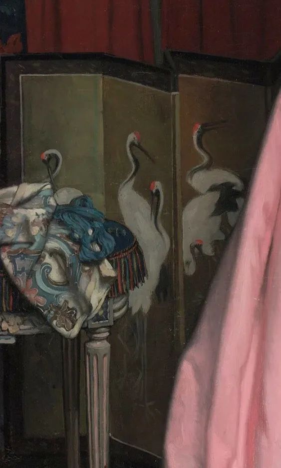 《米拉蒙侯爵夫人肖像》/James Tissot / 1866年/ 盖蒂博物馆藏。画中,一位法国的侯爵夫人正站在家族大宅波亚克城堡(Château de Paulhac)的一个壁炉边,身后是一幅金碧白鹤屏风。那浓艳瑰丽的屏风