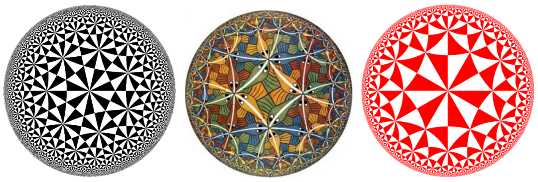 图3. 庞加莱圆盘。中图为埃舍尔版画作品“圆的极限”之三,右图为庞加莱圆盘的6-4-2三角铺排。