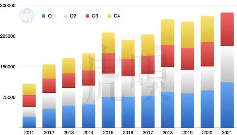 2011~2021 年苹果总营收(百万美元),请注意 2021 年度第四季度(七至九月)尚未计算。那到底苹果这季度财报有多好?事实上苹果在 2021 年过得非常滋润。要知道苹果在 Q1~Q3(去年十月至今年六月)九个月的营收,竟然已超过去年全年总和。即使 Q3 向来也是苹果的淡季,但“淡季”的营收居然也超越了去年 Q1 传统旺季之外的所有季度。