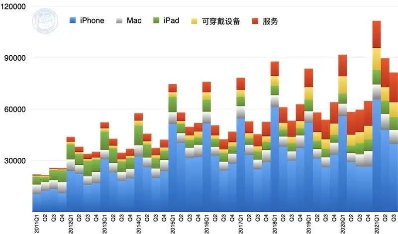 2011~2021 年苹果总营收(以产品分类)(百万美元)最不科学的是,本季毕竟为 iPhone 12 产品周期最后季度,销量不可能会很好,统计机构 Canalys 就估计,本季度 iPhone 销量增长就只有可怜的 1%,与小米手机在本季度实现 83% 同比增长的成绩比起来,简直不值一提。所以,照理本季度业绩增长火车头不该是 iPhone,也照理本季度苹果的业绩不会太好。即使华尔街仍然高度看好 iPhone 的营收增长,但估计增长率就只有 28.7% 左右。