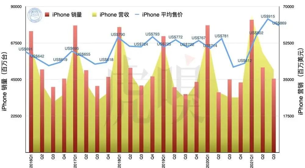 2016~2021 年 iPhone 的销量、营收与平均售价。请注意 2019 年开始的销量数据均基于 Canalys 数据由于苹果在 2019 以后没有再公开 iPhone 的销量数据,加上在截稿之前,包括 IDC 等几家主要的统计机构,也没有释出相关的销量数据。所以 Odin 只能通过先前 Canayls 估算的 1% 增幅来计算得出,发现关键仍然是 iPhone 的平均价格:如果 iPhone 销量真的仅增加 1%(上图红色条),但营收却比去年同期暴增 50%(上图黄色区域),其平均售价定必大幅激增(上图蓝线)。