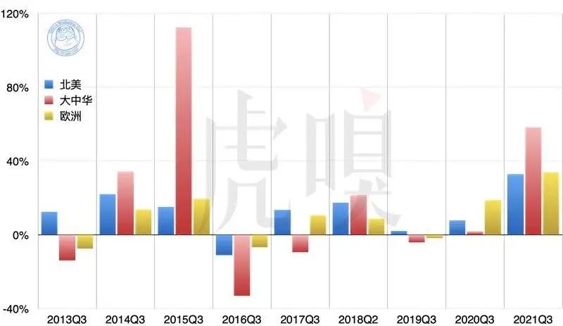 本季的苹果营收的地理分布,其实与去季也相当相似,同样在各地开花,但大中华地区一枝独秀。