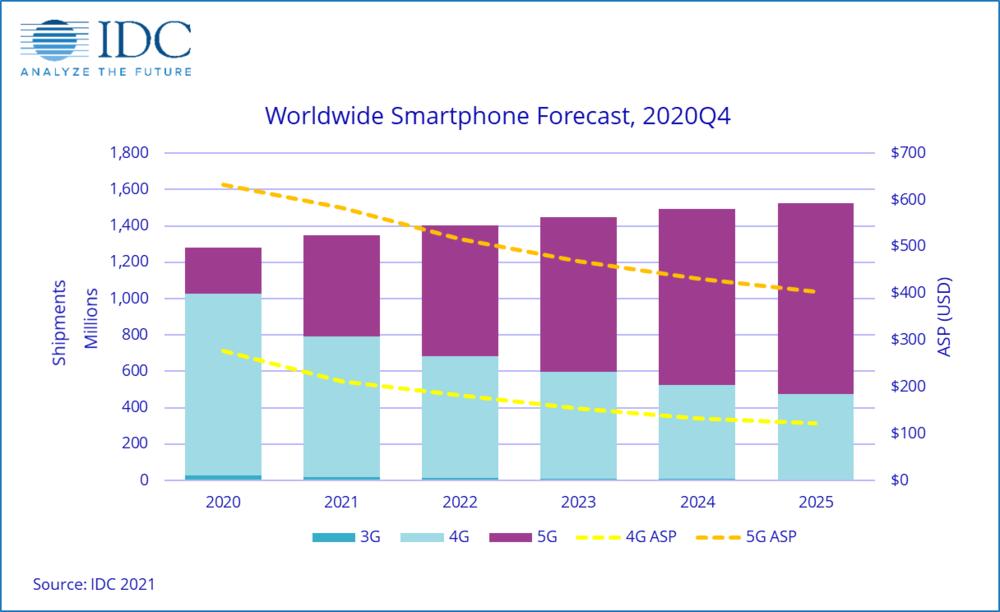 图片来源:IDC调研机构 IDC 也做出过类似的预测。他们认为 5G 仍然是手机行业的驱动因素,2021 年 5G 智能手机出货量将占全球销量的 40% 以上,2025 年更将增长到 69%,而 5G 手机的复合年增长率将达 3.6%(上图)。问题是:情况真的如此理想吗?笔者仍然持保留态度。