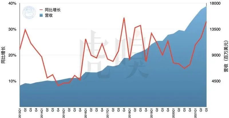 苹果的服务营收与同比增长率,2013~2021事实上,随着这一年苹果用户基数的不断扩大,苹果的服务营收和增长率也同样不断增长(上图),实现了逾 170 亿美元的营收,其营收更超越 Mac 和 iPad 两大业务的总和。