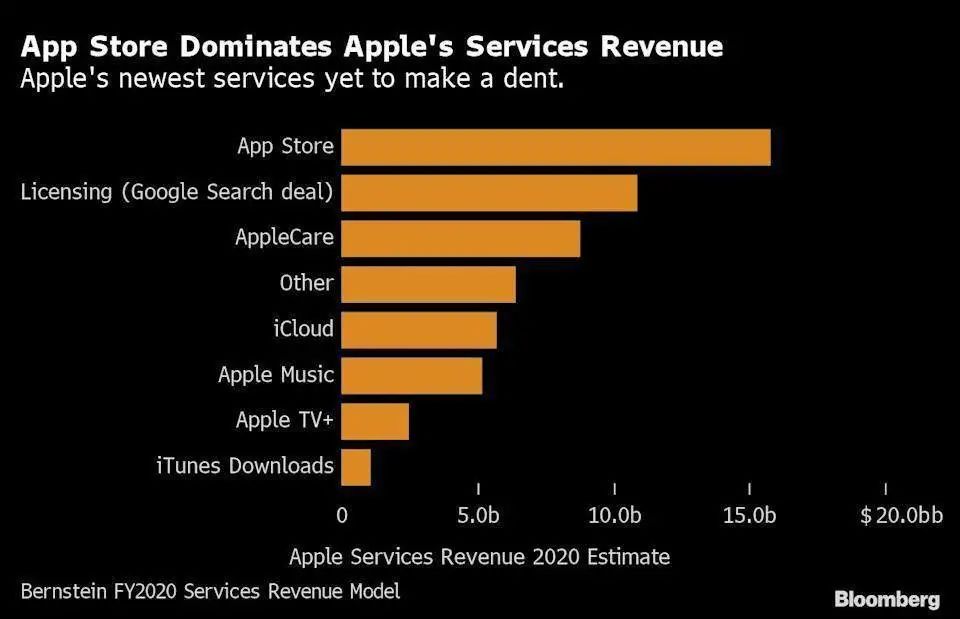 图片来源:Bloomberg via Yahoo! Finance目前,我们只能通过一些第三方机构,估算这部分营收当中,只有少部分来自所谓的“订阅用户”,其主要收入来源,其实来自 App Store(上图)。但偏偏这个最重要的收入来源,近月却受到严重的挑战:在近月,Epic Games 与苹果大打官司,揪出了苹果 App Store 许多不为人知的内幕;而苹果在隐私上的多番动作,也挑动了不少互联网企业的敌视和质疑。