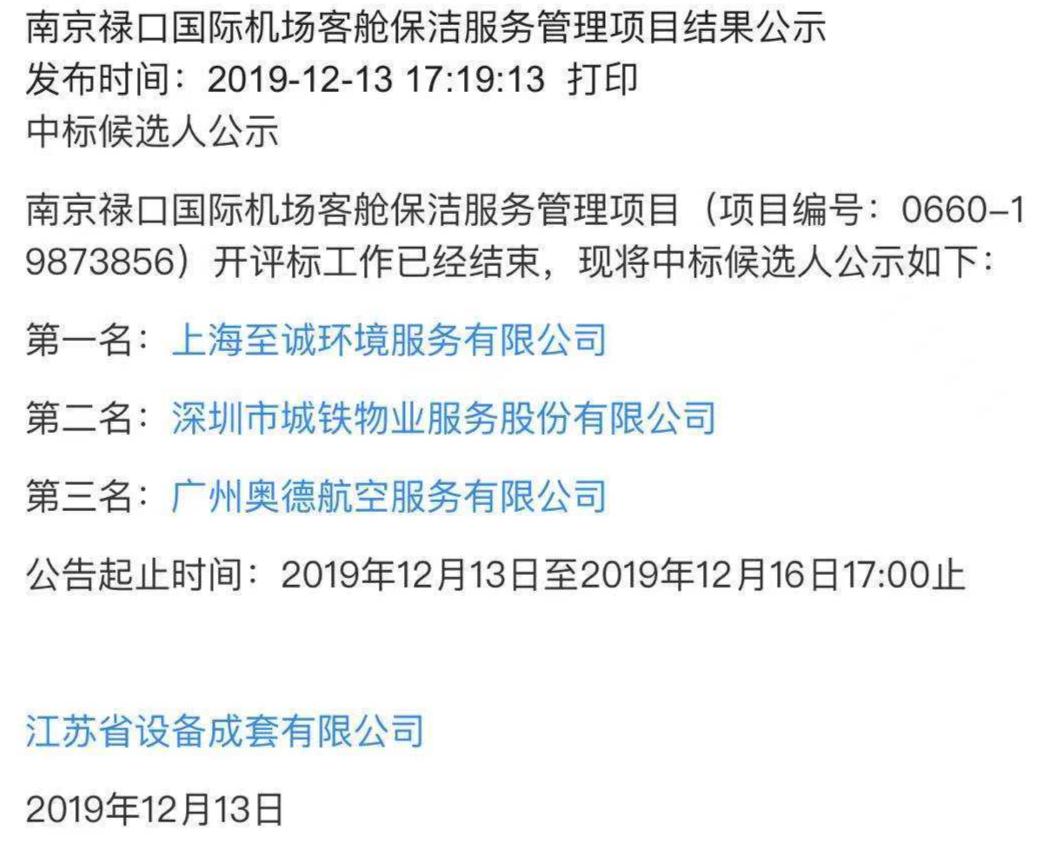 上海至诚环境服务有限公司曾中标东部机场集团有关项目。而在查询上述2个项目的最后中标公告后,红星新闻记者看到,最终中标禄口国际机场T2航站楼和交通中心保洁服务,T2航站楼隔离区小手推车服务与管理,机场贵宾区(贵宾A区、B区),机场国内和国际头等舱休息区、机场公务机楼的保洁服务,以及客舱保洁服务和客、货机保障中的机上排污、加水、垃圾收运等工作项目的公司均为上海至诚环境服务有限公司。