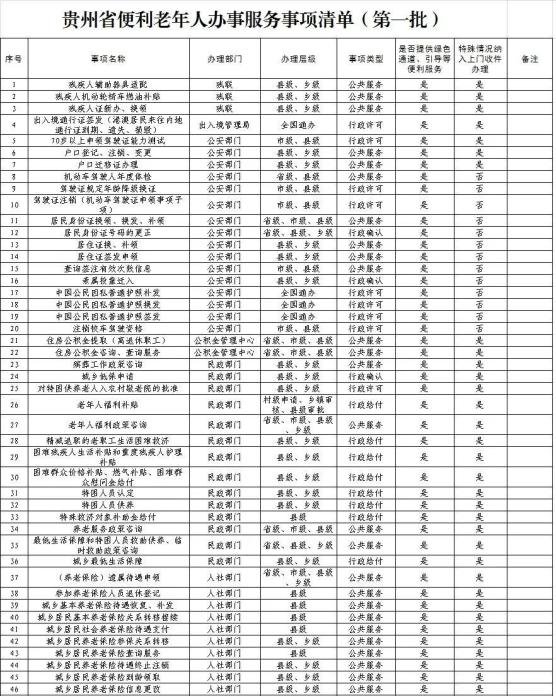 《贵州省便利老年人办事服务事项清单(第一批)》具体如下: