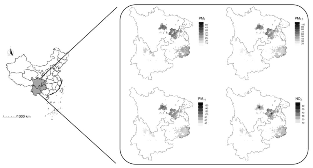 图 1.2 研究估算了四个省级行政区的空气污染水平结果发现,3年平均的PM1、PM2.5、PM10和NO2水平每增加10 μg/m3,相应的QUI指数就会下降5.38个单位(95%CI -6.17~-4.60)、1.89个单位(95%CI -2.33~-1.44)、0.77个单位(95%CI -1.08~-0.47)和2.02个单位(95%CI -2.32~-1.71),提示骨骼强度降低。