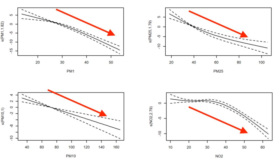 图 1.4 原来的骨骼越强健,骨强度因为空气污染下降越明显此外,研究发现PM1、PM2.5、NO2对骨强度的影响在加入另一种污染物的影响后基本一致;以2年或4年的暴露水平来分析也得到了相似的结果。年龄、性别、是否吸烟、居住于农村或城市对于分析的结果有一定的影响,城市居民、女性、从不吸烟者和 65 岁以下人群对长期空气污染更为敏感。不过,空气污染越严重,骨骼强度往往更低。
