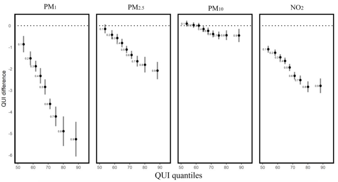 图 1.3 空气污染越严重,骨骼强度越低同时,研究还发现骨骼强度较高的人群可能更容易受到空气污染的影响。比如,QUI>88.36个单位,骨骼最强健的10%的人群中,3年的PM1暴露水平每增加10 μg/m3,相应的QUI降幅就达到5.21个单位(95%CI -5.90~-4.29);而在QUI<53.71个单位,骨骼最脆弱的10%的人群中,3年的PM1暴露水平每增加10 μgm3,相应的QUI降幅就仅为0.92个单位(95%CI -1.31~-0.52)。