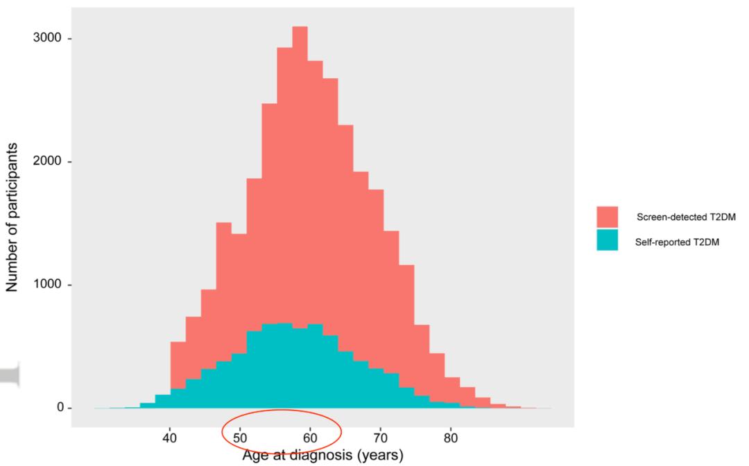 图 3.2 五六十岁是诊断出糖尿病的“高峰”结果发现,尽管老年糖尿病患者的白蛋白尿的绝对患病率较高,但2型糖尿病患者与匹配对照组的白蛋白尿风险随着诊断年龄的升高而降低。对于年龄 <50、50~59、60~69 或≥70 岁诊断为糖尿病的参与者,糖尿病患者的白蛋白风险增加了81%、60%、45%和33%,自我报告的糖尿病患者分别为中增幅分别为135%、121%、90% 和 58%。