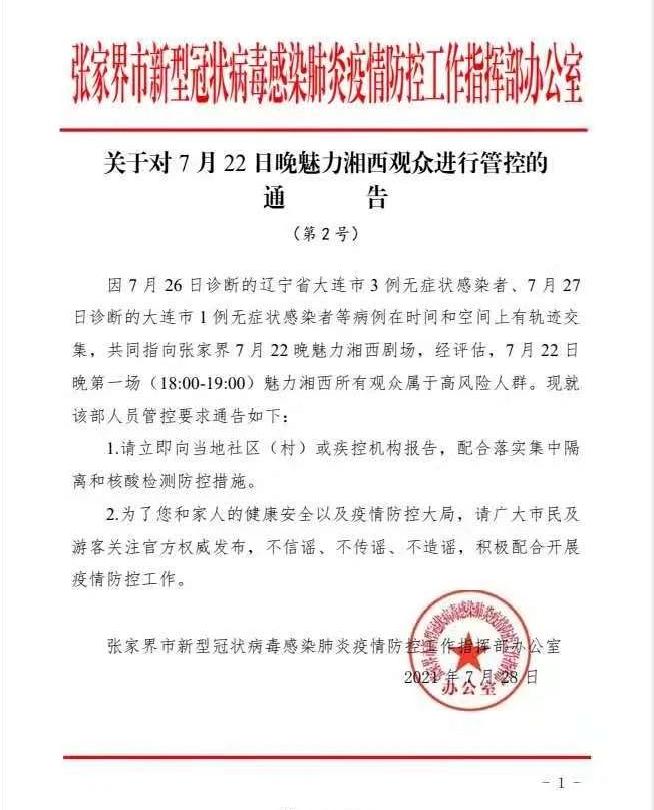 近日,江苏省淮安市、辽宁省大连市和四川省成都市均报告发现新冠肺炎本土感染者,活动轨迹共同指向湖南省张家界7月22日晚魅力湘西剧场,为切实保障我区群众生命安全和身体健康,现就近期有过张家界旅居史人员紧急提醒如下:1. 请7月17日以来有湖南省张家界旅居史的人员立即向当地社区(村)报告,并告知工作人员是否有观看7月22日的魅力湘西表演,配合落实相应健康管理措施。