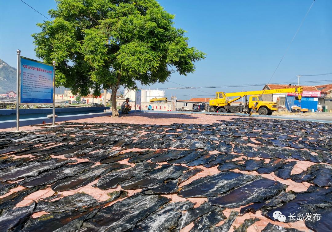 每年的海带收获季节,整个大钦岛就是一个巨大的晒场,无论是海滩、路旁、山坡、房前、屋后,只要有空闲的地方,都被用来晾晒海带。晾晒的海带每隔一段时间就要翻一下,确保两面都均匀受热。空中俯瞰,纵横交错的晒场仿佛整齐划分的梯田,饱蘸着海水的新鲜海带舒展在晒场上,自在的吸收盛夏阳光的照射,慢慢褪去水分,坦露出海洋植物固有的本色。