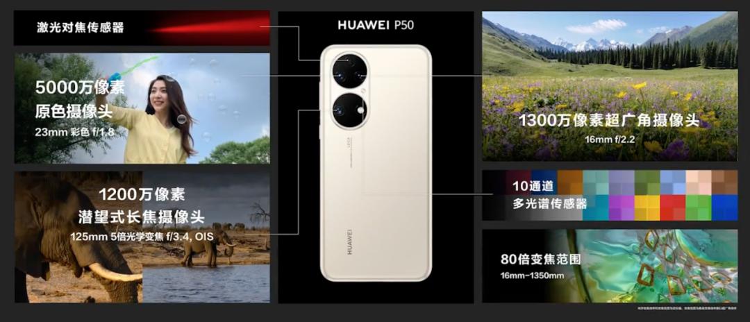 P50 搭载了一颗 5000W 像素主摄、 1300W 超广角以及 1200W 像素的 5 倍光学变焦镜头,能满足 80 倍的变焦范围。