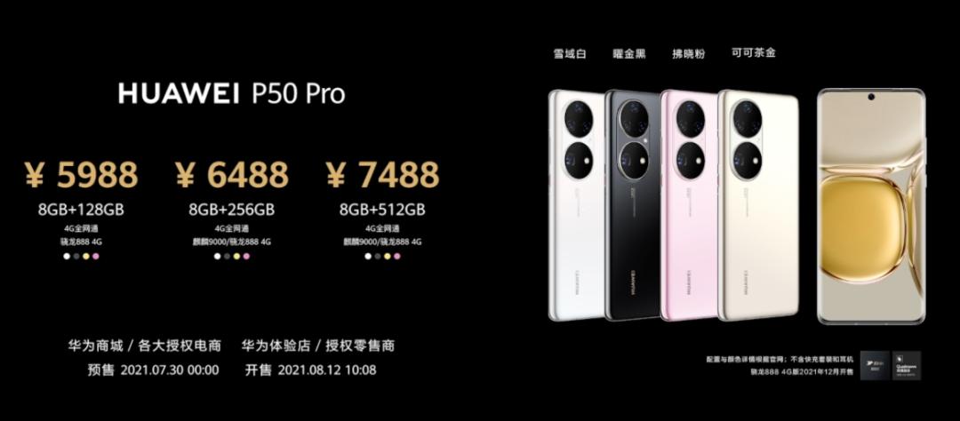 P50 Pro 方面,白、黑、粉、金配色的 8GB+128GB 售价 5988 元, 8GB+256GB 售价 6488 元, 8GB+512GB 售价 7488 元。其中 8GB+128GB 版本仅有骁龙 888 4G 处理器,另外两款则有麒麟 9000 和骁龙 888 4G 两种处理器。