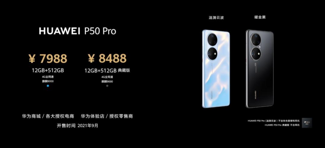 而 P50 Pro 涟漪云波配色仅有 12GB+512GB 一款,售价 7988 元;P50 Pro 典藏版仅有黑金 12GB+512GB 一款,售价 8488 元,均搭载麒麟 9000 处理器。