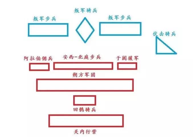 缓过神来的唐朝 开始将四大藩镇的精兵内调在经历了最初的措手不及后,唐朝已经在公元757年完成了全部动员。大批原本不在内地的精锐边军,从安西、河西、北庭、朔方的军营赶到,让叛军失去了战力优势。同时,唐朝在内地又增设了额外的节度使和军团建制,期望招募更多人参加作战。只是考虑到先前在洛阳和潼关的糟糕表现,皇帝与将军们都对这些新募部队没有太大期望。