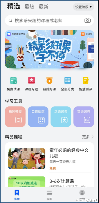 另一方面,华为搭建了“华为教育中心”APP,与优质教育机构合作,实现了实现了教、学、评、测、练的一体化服务。