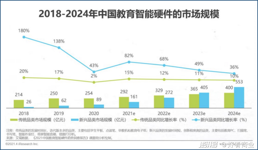 艾瑞咨询发布的《2021中国教育智能硬件趋势洞察报告》显示,2020年智能教育硬件市场规模为343亿元,2021年预计将达到453亿元,2024年有望接近1000亿元规模。