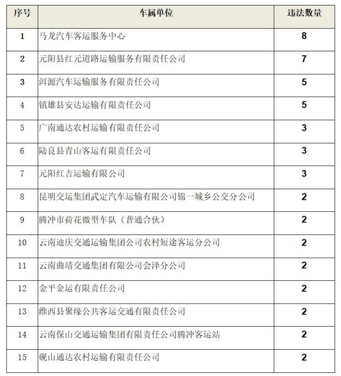 其中,公路客运车辆3038起,涉及254家公路客运企业;旅游客运车辆569起,涉及107家旅游客运企业;危化品运输车辆852起,涉及146家危化品运输企业。其中,未处理交通违法较多的道路运输企业如下表所示: