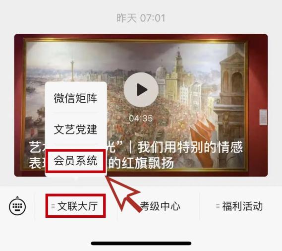 2、进入微信号功能栏“文联大厅”里的“会员系统”,即可找到您的专属电子会员证