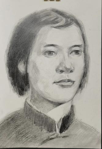 贺英的手绘画(作者:郭雨垚)“快,快走,找红军,找大舅去!”贺英一边拖着被打断的右腿、倚在门边还击国民党团防,一边把装有两个戒指、五块银元、一把小手枪的小包袱塞给七岁的向轩,催促他赶快找大舅贺龙去。